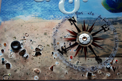 Usei tinta acrílica, gesso, folhas de livro velho, distress ink, tinta de álcool, lã de feltro, lantejoulas, e lixo...rsrsrrs... missangas e outros berloques com mistura de metais. Ah! e uma foto maravilhosa da minha excepcional modelo. No final até que gostei.