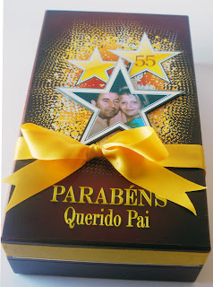 Caixa reciclada e personalizada com presente para um pai querido, encomenda da filha que faz aniversário no mesmo dia e que está longe fisicamente. Como eu gostei de criar este presente.