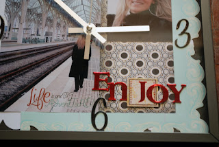 Detalhe do titulo, a palavra "Journey" faz parte de uma Chip tile que era branca. Usei canetas tombo, distress ink, pastel de óleo, embossing a quente só para destacar essa palavra.