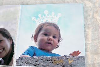Última página como nome da mãe e do pai do Martim feito com embossing a quente e mascara da coroa com distress ink.