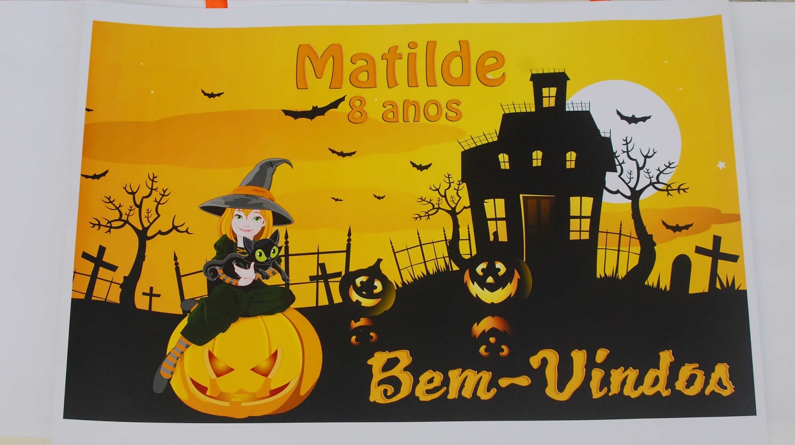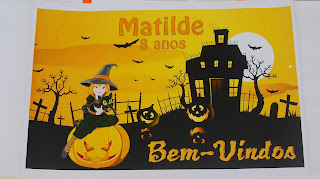 A festa da Matilde, teve como tema halloween. Fizemos para lembrança magnéticos e para decoração um banner e um cartaz.