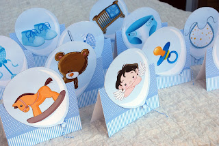 Azul e branco e pequeno elefante foram a base dos itens criados para a festa chá de bebé do Tomás.