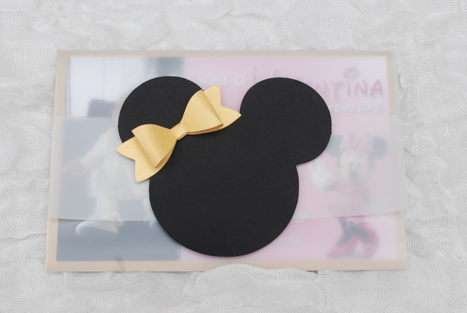 Convite e tags de docinhos, no tema Minnie nas cores rosa e dourado. Aplicações em dourado laminado.